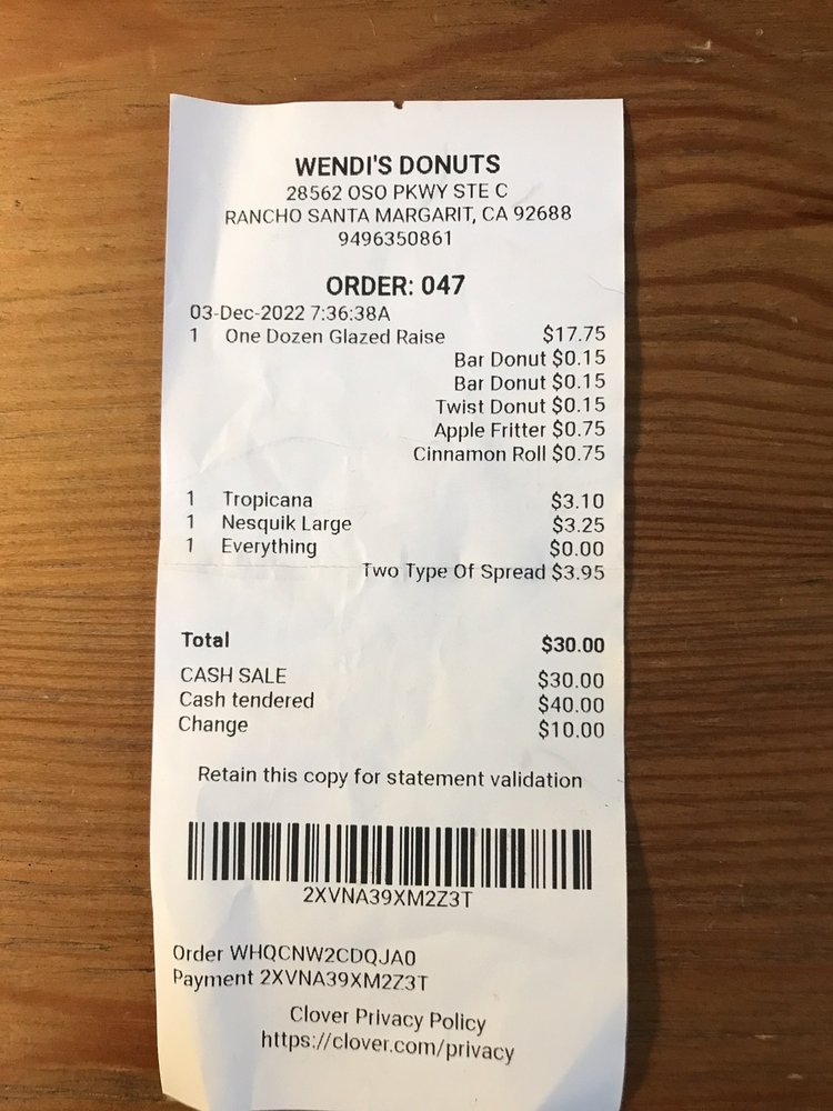 Wendi's Donuts, located in Rancho Santa Margarita, CA, is a must-visit for donut lovers. With rave reviews from customers like Emma S., Cime P., Dan S., Brandon S., and Darius O., it's clear that this small family-owned shop offers top-notch pastries and bagels. The menu boasts a variety of delicious donuts, croissants, bagels, and pastries that are always fresh and tasty. Customers appreciate the generous portions, quick service, and friendly staff at Wendi's. Whether you're in the mood for a classic glazed donut or a hearty bagel sandwich, Wendi's Donuts has you covered. Stop by for a satisfying breakfast or snack, and indulge in some of the best treats in town!